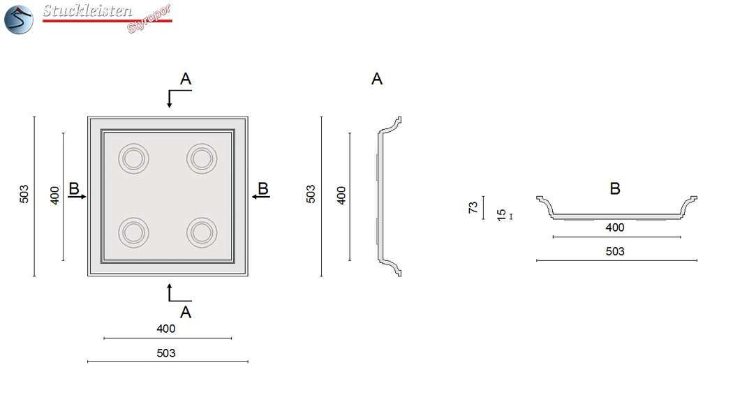 Die Stucklampe aus Zierleisten mit LED Einbauleuchten 'Bayern 10/500-500-1' verfügt über eine Höhe von 73 mm, eine Kantenlänge von 503x503 mm und 4 eingebaute, warmweiße LED Spots. Die Einbaurahmen sind fix und weiß.