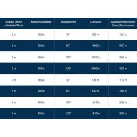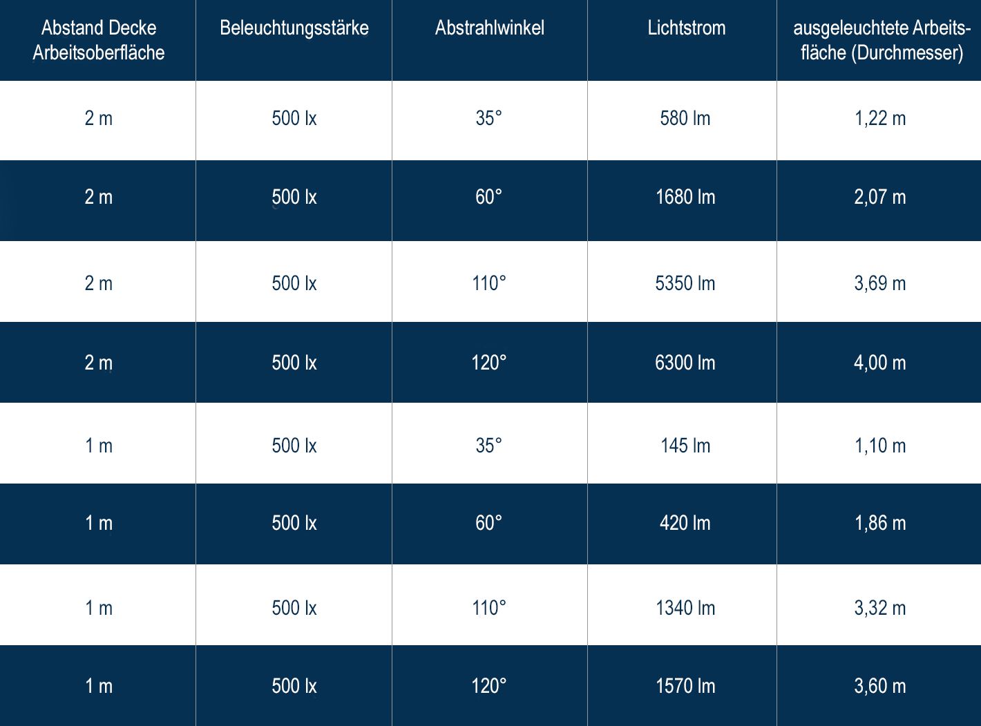 In der nachfolgenden Tabelle können Sie sich selbst anschauen, wie sich der Abstrahlwinkel und der Abstand auf den Lichtstrom (die Lumenzahl) auswirken, wenn wir die benötigte Beleuchtungsstärke von 500 Lux zu Grunde legen. Da Lichtmessungen beim Hersteller in einer Entfernung von 1 Meter durchgeführt werden, haben wir auch diese Daten zu Ihrer Information mit in die Tabelle aufgenommen.