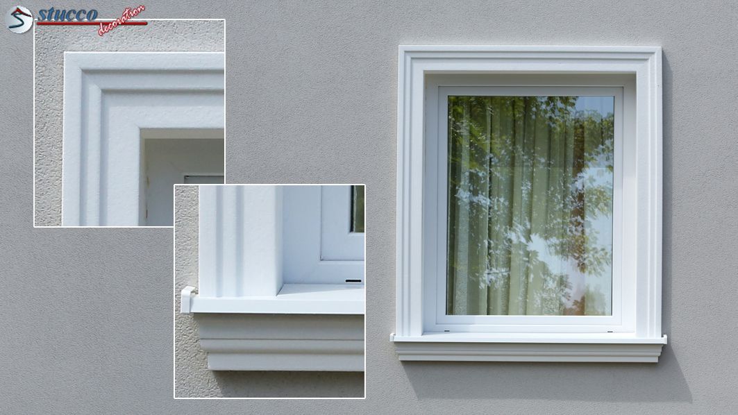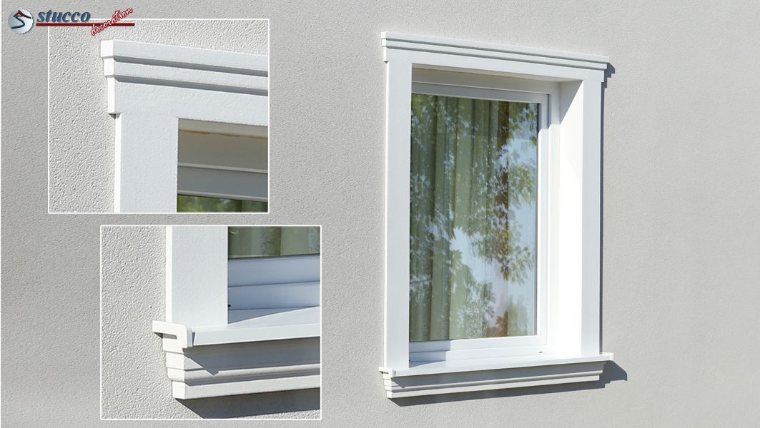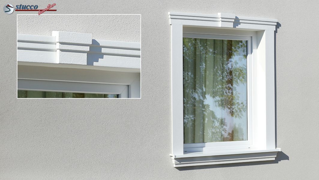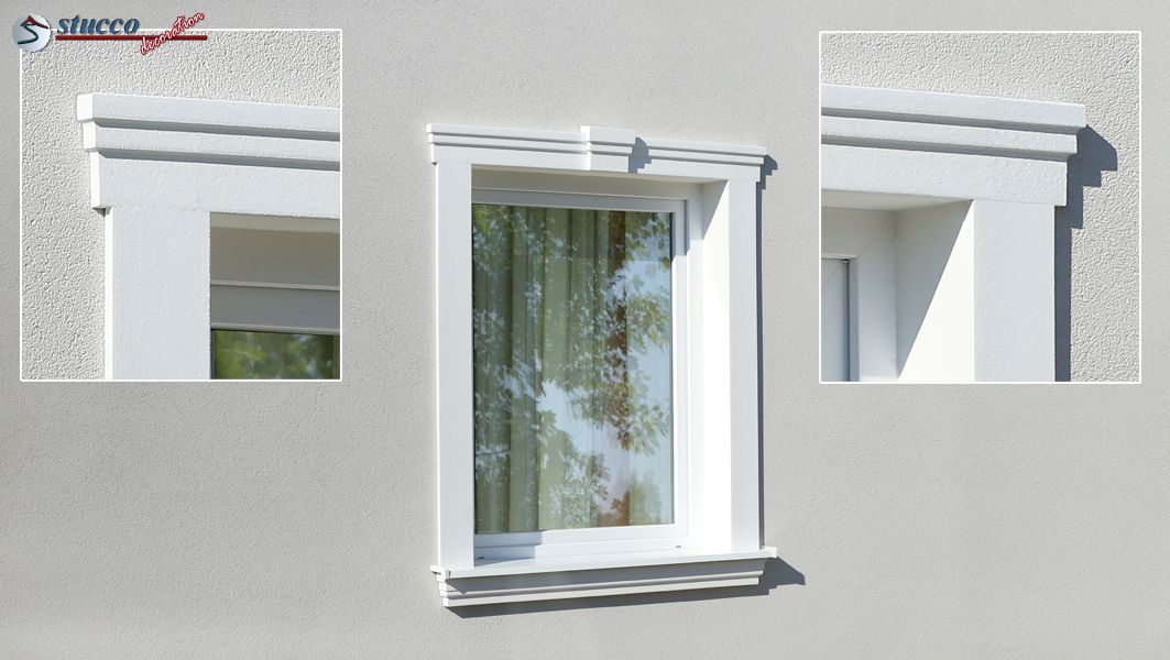Um die Fenster und Türen an der Hausfassade stilvoll zu umranden, eignet sich unser beliebtes Fassadenprofil Bangkok 103 hervorragend. Dank der durchdachten Form wirkt die Aussenstuckleiste als Fensterumrandung dezent und elegant. Bei der einfachsten Variante der Fensterumrandung wird das gleiche Zierprofil an drei Seiten des Fensters verwendet. Das Eckelement, in Größe und Design zum Fassadenprofil passend, bieten wir als Serienprodukt an. So geht das Anbringen der Aussenstuck Stuckleiste zur Fensterumrandung schnell und unkompliziert. Da das Fassadenprofil Bangkok 103 unten über eine Tiefe von 18 mm verfügt, eignet es sich perfekt, um bei der Fensterumrandung mit dem Stuckprofil Freetown 100 kombiniert zu werden. Am Fenstersturz montiert wirkt das Fassadenprofil Bangkok 103 dekorativ und prachtvoll. Standardmäßig bieten wir auch zum seitlichen Abschluss rechte und linke Schließelemente zu diesem Stuckprofil an.