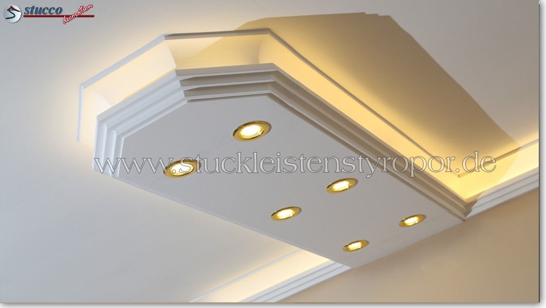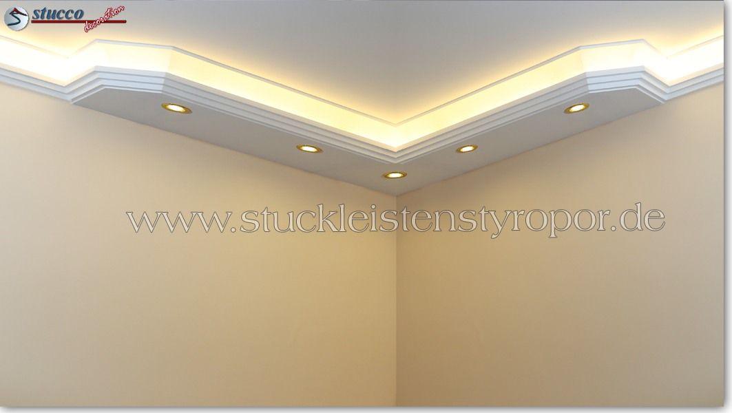 Planen Sie gerade die Wohnzimmer Beleuchtung oder die Bürobeleuchtung mit Stuck und LEDs? Alles ist mit den Lichtleiste für die direkte und indirekte Deckenbeleuchtung, LED Spots und LED Stripes möglich! In den unteren Teil der Kombi Lichtleisten für direkte und indirekte Beleuchtung können Sie LED Spots, seitlich LED Stripes einbauen. Die U-Profile und L-Profile unserer Styroporleisten für kombinierte Beleuchtung LED haben eine Länge von 100 cm.