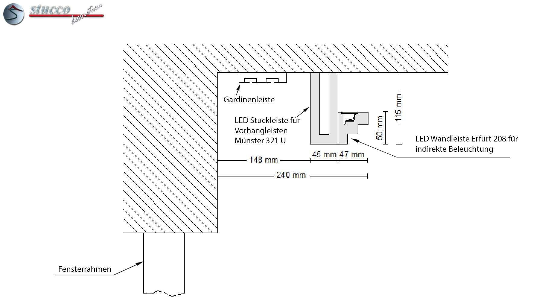 Wenn Sie die indirekte Beleuchtung auch über die Fenster weiterführen möchten, können Sie die LED Stuckleiste Erfurt 208 Plexi Plus mit dem Basisprofil Münster 321 U kombinieren. Wie auf der letzten Skizze zu sehen ist, wird das Basisprofil Münster 321 U an die Decke, vor die Gardinenleiste montiert. An die Vorderseite des Basisprofils kann dann die LED Stuckleiste Erfurt 208 Plexi Plus angeklebt werden.