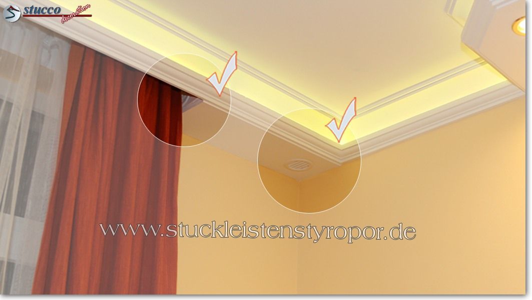 Die Vorhangleiste Hamburg 203 PLEXI PLUS ist zum Weiterführen der Stuckleiste für indirekte Beleuchtung Hamburg 203 PLEXI PLUS vor den Gardinenschienen. Mit dieser Vorhangleiste lassen sich die Gardinenschienen elegant verbergen. Der in Preis und Lieferumfang enthaltene Plexistreifen lässt das Licht der LEDs ungehindert hindurch und schützt Ihre LED Strips vor Staub und Insekten. Mit dem Einbau der LED Reflektorleisten optimieren Sie Ihre indirekte Beleuchtung, denn Sie verdoppeln die Lichtstärke der LED Streifen, kühlen die LEDs und verhindern das Durchscheinen des Lichts durch die Styroporleiste.